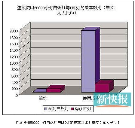 有業(yè)內(nèi)人士向記者算了一筆賬,一盞5瓦LED燈泡的價(jià)格為18.9美元(約合118.9元人民幣),平均壽命約為50000小時(shí),若按廣州市八區(qū)住宅電價(jià)為0.61元/瓦計(jì)算,使用LED燈維持50000小時(shí)照明的使用成本約為270元人民幣。而60瓦白熾燈的售價(jià)約為3元,可平均壽命只有1500小時(shí),按同樣條件計(jì)算,白熾燈的使用成本約為1932元?!白璧KLED照明產(chǎn)品大規(guī)模應(yīng)用的一大因素就是價(jià)格,成本降低將推動(dòng)LED照明產(chǎn)品加速普及?!睆V東省照明電器協(xié)會(huì)會(huì)長(zhǎng)全健如此表示。